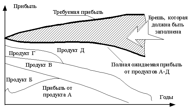 С целью определить брешь (gар) на рынке используется gар-анализ. Например, исследование потоков прибыли при производстве и реализации различных продуктов компании (рис. 4.3) может обнаружить брешь, которую следует заполнить.