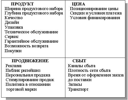 Комбинация четырех маркетинговых инструментов обычно составляет комплекс маркетинга. На рис. 5.9 перечислены виды деятельности, относящиеся к этим четырем компонентам: продукту, цене, продвижению и сбыту. Каждый из четырех компонентов может быть представлен как подкомплекс маркетинга, например, продуктовый комплекс, комплекс сбыта, комплекс коммуникаций и ценовой комплекс.