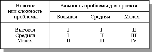 Создание инновационного проекта обычно строится на требованиях типа I, хотя в итоге далеко не все проблемные аспекты исследования будут соответствовать этой категории. Так, например, отдельные аспекты проблем анализа рынка могут оказаться маловажными для проекта и быть аспектами средней или малой сложности. Как правило, подготовка инновационного проекта должна отвечать требованиям типа II, а исследование возможностей – требованиям типа III и IV.