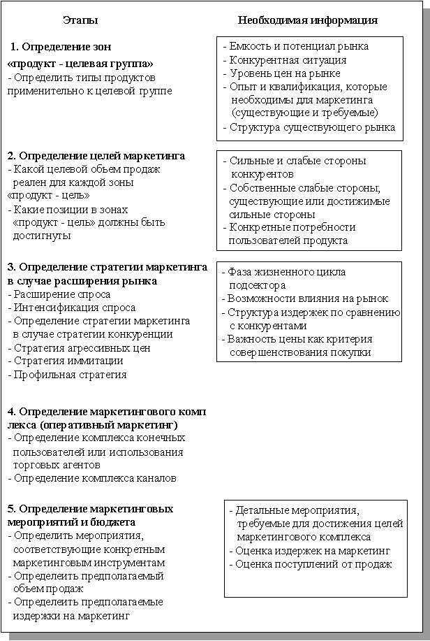 Принципиальный вопрос заключается в следующем: какая маркетинговая стратегия подходит для достижения целей маркетинга в соответствии с условиями, определенными стратегией инновационного проекта? Выработка маркетинговой стратегии требует долгосрочной ориентации планирования нововведения и долгосрочных действий на рынке, после того как нововведение поступило в эксплуатацию (противоположная концепция состоит в реагировании на текущие изменения в экономической ситуации).