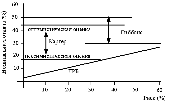 Риски, связанные с диапазоном отдачи в НИОКР (например, по [26]), могут быть оценены с использованием ЛРБ. Риски, большие ЛРБ для данного уровня отдачи НИОКР, будут заставлять инвестора отказываться от вложений в НИОКР в пользу акций и казначейских обязательств. Риски меньшие, чем по ЛРБ, вызовут отток капиталов с фондового рынка в пользу НИОКР. Рассматривая эти альтернативы, можно сделать заключение, что наиболее вероятен сценарий – ЛРБ, где адекватное соотношение минимально допустимых отдач НИОКР при любых уровнях риска.