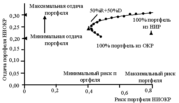 Для того чтобы оценивать риски и доходность портфеля НИОКР, следует рассмотреть эти выходные характеристики при различных соотношениях НИР и ОКР в портфеле (при изменении доли НИР от 0 до 100% объема НИОКР).