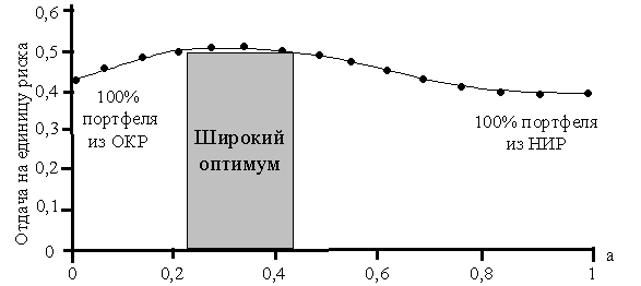 Рис. 8.4. Зависимость отдачи на единицу риска от доли НИР в портфеле