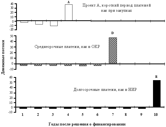 Три типа политики инвестиций показаны в сравнении на рис. 8.5. Тип А предполагает высокие затраты за короткое время и немедленную отдачу средней величины (как при закупках). Тип D характеризуется задержками отдачи при её более высоком среднем уровне (как при ОКР). Тип R характеризуется относительно мелкими затратами в течение долгого периода, долговременной задержкой отдачи при широкой применимости и потенциально большой величине отдачи (как при НИР).