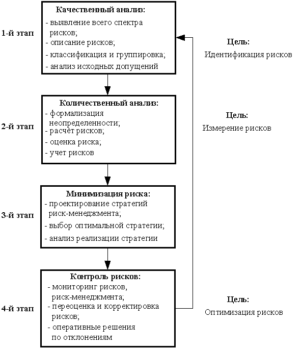 Итак, значение любого риска для каждого участника индивидуально, а общий риск инновационного проекта есть сложная система частных (в том числе, индивидуальных) рисков со сложными многочисленными связями. Система риск-менеджмента инновационного проекта должна содержать стадии в соответствии с рис. 9.1 [6].