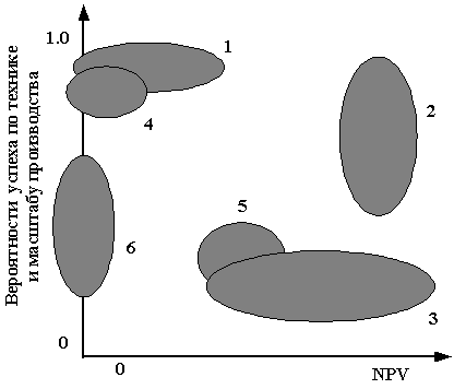 Анализ графиков проектов (рис. 9.3) дает полезную информацию для решений по организации НИОКР. Например, расположение кластеров эллипсов неопределенности на графике вероятность успеха – чистая текущая стоимость (NPV) совместно с перечнями ключевых факторов, определяющих риск и будущие денежные потоки, и оценками тенденций годовых объемов продаж и необходимых ресурсов для окончания проектов фактически определяют текущие ранговые оценки проектов в портфеле НИОКР фирмы. В табл. 9.1. приведены неопределенности, которые могут существенно влиять, по мнению авторов [36], на вероятность технического или производственного успеха проекта и его NPV.