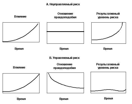 Очевидно, что диапазон возможных источников риска достаточно широк. Степень влияния конкретного риска часто зависит от того, что уже проинвестировано к моменту оценки. Если в этом случае будет сделана попытка вернуться назад, то, безусловно, задержится прогресс разработки. Ключом к управлению рисками является контролирование их вероятности появления, которая уменьшается с прогрессом разработки. Риск остается, но, управляя им, мы снижаем шансы того, что возможна катастрофа. Эффективно управляемый риск менее разрушителен, чем работа в режиме реакции на его проявление. Характер ситуации при управляемом и неуправляемом рисках отражен на рис. 9.5.