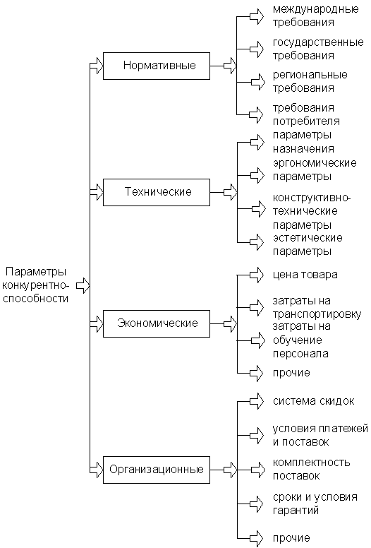 Параметры конкурентоспособности продукции (рис. 1.2) подразделяются на нормативные (соответствие товара стандартам, техническим условиями, законодательству), технические (технологические свойства товара, определяющие область его применения, надежность, долговечность, мощность и т.д.), экономические (уровень расходов покупателя на приобретение, потребление и утилизацию товара, т.е. цена потребления) и организационные (система скидок, комплектность поставок, сроки и условия поставок и пр.).