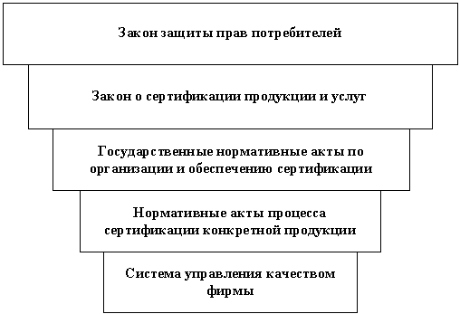 Обеспечение интересов потребителя, в соответствии с законом, побуждает государство создать механизм производства продукции с уровнем качества, соответствующим возрастающим потребностям потребителя. Одним из начальных нормативных документов построения такого механизма является Закон Российской Федерации о сертификации продукции. Действующим Законом РФ «О сертификации продукции и услуг» определено, что сертификацией продукции является процедура подтверждения соответствия, посредством которой независимая от изготовителя (продавца, исполнителя) и потребителя (покупателя) организация удостоверяет в письменной форме, что продукция соответствует установленным требованиям. Таким образом, сертификация продукции – это процесс, в результате которого государство совместно с производителем обеспечивает потребителю защиту его прав на приобретение продукции с декларированными в ГОСТах и нормативно-технической документации показателями качества и на объективную информацию об этой продукции. Этот закон характеризует следующий уровень нормативной сферы (рис. 5.4), являясь важнейшим директивным государственным документом, и устанавливает правовые основы обязательной и добровольной сертификации продукции и услуг, а также права, обязанности и ответственность участников сертификации. В нем впервые на столь высоком уровне дается понятие сертификации продукции и указываются ее цели. Назначается орган в лице Госстандарта России, в обязанности которого входит формирование и реализация государственной политики в области сертификации на территории страны.