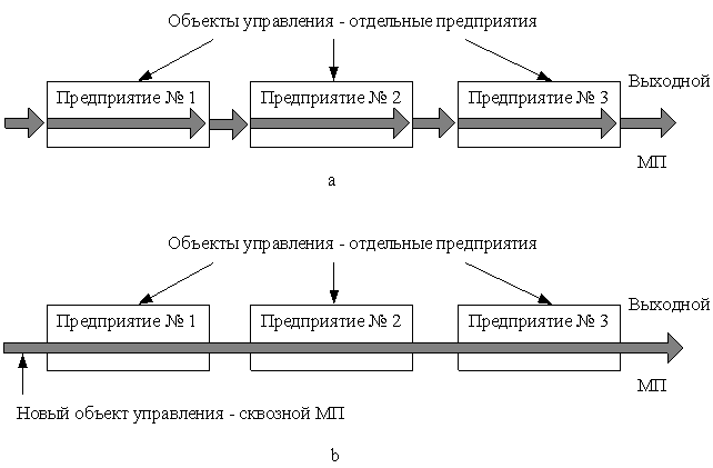 На макроуровне МП проходит по ЛЦ, состоящей из нескольких самостоятельных предприятий. Традиционно управление каждым из предприятий осуществляется обособленно его собственником (рис. 1.3, a). При этом понятие сквозного МП не выделяется и задача управления им не ставится и не решается. В результате такие важные показатели этого потока, как себестоимость, надежность поступления, качество и др., на выходе цепи складываются в определенной степени случайно и бывают далеки от оптимальных. При логистическом подходе объектом управления является сквозной МП (рис. 1.3, b). При этом обособленность предприятий в значительной степени преодолевается с целью согласования управления сквозным МП. Нужный груз начинает поступать в нужное место, в нужное время, в необходимом количестве, необходимого качества. В рамках всей цепи продвижение МП происходит с минимальными затратами.