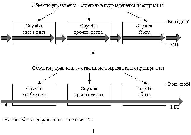 На микроуровне ЛЦ состоит из различных служб одного предприятия. При традиционном подходе задача совершенствования сквозного МП внутри предприятия, как правило, не имеет приоритетного значения ни для одного из подразделений (рис. 1.4, а). Показатели МП на выходе предприятия так же, как и в случае макроуровня, далеки от оптимальных.