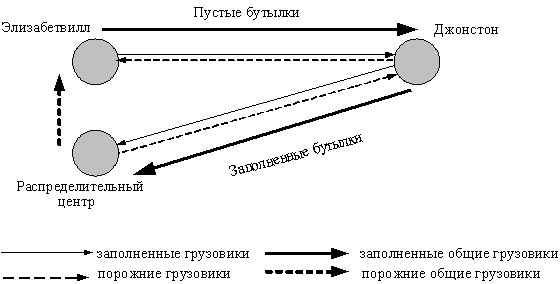 Корпорация Confederated Bottlers раньше доставляла бутылки со своего основного предприятия в Элизабетвилле на пивоваренный завод в Джонстоне, расположенный на расстоянии 115 миль. После заполнения на пивоваренном заводе бутылки отправлялись в распределительный центр, расположенный на расстоянии 20 миль от Элизабетвилля. Для перевозки своей продукции обе компании использовали собственные грузовики, которые после доставки груза возвращались порожние. После проведения анализа этой ситуации компании создали единую транспортную компанию, грузовики которой доставляют и пустые, и заполненные бутылки. В результате такой интеграции расходы на перевозку снизились почти наполовину (рис.6.1).