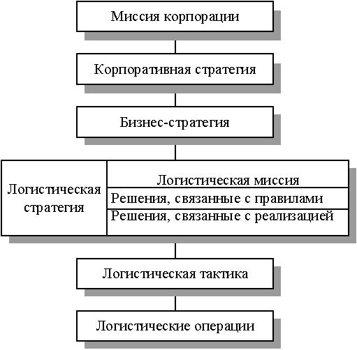 Миссия – заявление, в котором указываются общие цели организации в целом. Корпоративная стратегия показывает как корпорация, осуществляющая диверсифицированную деятельность, планирует реализовать свою миссию. Бизнес-стратегия свидетельствует, как каждый вид бизнеса в рамках диверсифицированной деятельности будет вносить свой вклад в корпоративную стратегию. Функциональные стратегии описывают стратегическую направленность каждой функции (в частности, логистической), реализуемой в организации. Таким образом, стратегии более высокого уровня задают цели и общую направленность организации, а функциональные стратегии показывают, как их можно реализовать.