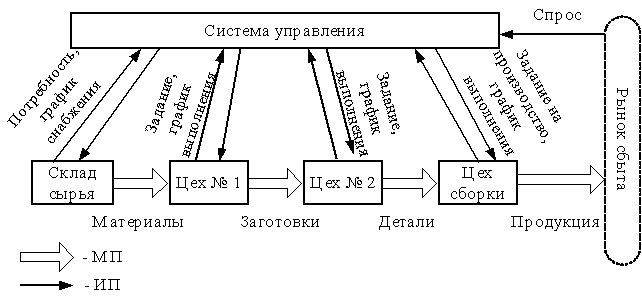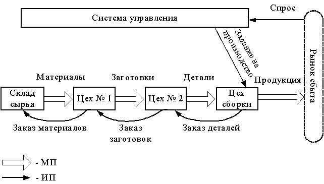 Тянущая система – это такая организация движения МП, при которой МР подаются («вытягиваются») на следующую технологическую операцию с предыдущей по мере необходимости, а поэтому жесткий график движения МП отсутствует. Размещение заказов на пополнение запасов МР или ГП происходит, когда их количество достигает критического уровня (рис. 7.10).