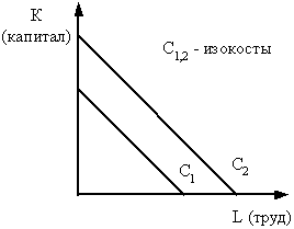 Фирма сталкивается с проблемой как достичь определенного объема производства с минимальными издержками. Предположим, что цена труда равна ставке заработной платы (w), а цена капитала равна арендной плате за оборудование (r). Издержки производства можно представить в виде изокост. Изокоста включает все возможные сочетания труда и капитала с равными валовыми издержками