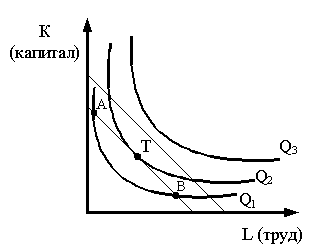 На графике равновесие фирмы отражает точка касания T изокванты с изокостой при Q2. Все другие сочетания факторов производства (A, B) могут дать меньший объем выпуска продукции.