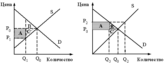 На рис. 14.6 и 14.7 треугольники В и С отражают полные убытки, связанные с государственным вмешательством в рыночное ценообразование.