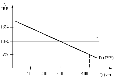 NIRR = IRR – r.Таким образом, инвестиционное решение может быть принято, если внутренняя норма доходности IRR³ r или NIRR³0, т.е. спрос на заемные средства определяется чистой внутренней нормой доходности NIRR (рис. 20.1). Для производства 100 кг продукции при ставке дисконта r=10% спрос на заемные средства формируется, т.к. IRR составляет 16%, следовательно NIRR = 6%. Для производства 400 кг продукции при этой же ставке r=10% внутренняя норма окупаемости IRR составляет 5%, следовательно NIRR=-5% – значит спрос на инвестиционные ресурсы формироваться не будет.