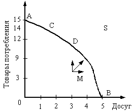 Если абсолютно все ресурсы общество израсходует на производство товаров народного потребления, то можно получить их максимальное количество и полностью отказаться от досуга (точка А), используя тот же ресурсно-технологический максимум, можно достичь обратной ситуации (точка В), когда в обществе существует только индустрия досуга. Между этими крайностями существует множество комбинаций распределения ресурсов и в той и в другой отрасли – точки С, D. Начиная с любой из этих точек, невозможно произвести больше одного товара, не урезая при этом производство другого товара. Объемы производства товаров народного потребления и индустрии досуга не только альтернативны, но и взаимозаменяемы в рамках ограниченных ресурсов.