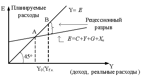 Рецессионный разрыв – величина, на которую должен возрасти совокупный спрос (совокупные расходы), чтобы повысить равновесный ВВП до неинфляционного уровня полной занятости.