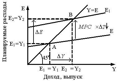 Приращение любого компонента автономных расходов вызывает несколько большее приращение совокупного дохода DY благодаря эффекту мультипликатора.