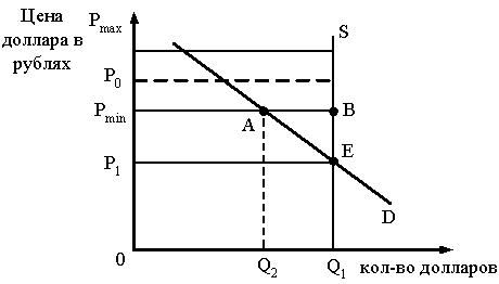 3. Плавающий курс. Обменный курс устанавливается в результате свободных колебаний спроса и предложения как равновесная цена валюты на валютном рынке. При системе абсолютно гибких валютных курсов колебания обменного курса ничем не ограничены, поэтому колебания объемов экспорта и импорта, а, следовательно, и состояния торгового баланса, текущего счета и платежного баланса в целом могут оказаться труднопрогнозируемыми, что может оказать дестабилизирующее воздействие на экономику.