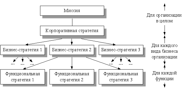 Корпоративная стратегия показывает как корпорация, осуществляющая диверсифицированную деятельность, планирует реализовать свою миссию. Бизнес-стратегия свидетельствует, как каждый вид бизнеса в рамках диверсифицированной деятельности будет вносить свой вклад в корпоративную стратегию. Функциональные стратегии описывают стратегическую направленность каждой функции (например, логистической, маркетинговой, инвестиционной и др.), реализуемой в организации. Таким образом, стратегии более высокого уровня задают цели и общую направленность организации, а функциональные стратегии показывают, как их можно реализовать.