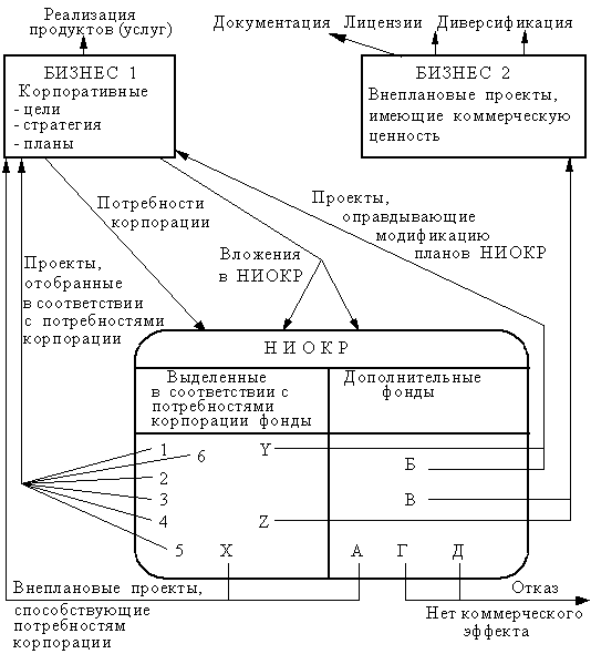 Бизнес 1 предполагает выделение ресурсов на НИОКР, большая часть которых расходуется на выполнение проектов, непосредственно связанных с реализацией стратегии корпорации (проекты 1-6). Часть средств выделяется на усмотрение руководителя НИОКР и используется для финансирования индивидуальных или неясных по результатам исследований. Проекты X, Y, Z - расширение формальной программы НИОКР или новые неожиданные возможности, появившиеся в ходе выполнения основной программы. Проекты А-Д возникают как результат исследований по дополнительным фондам.