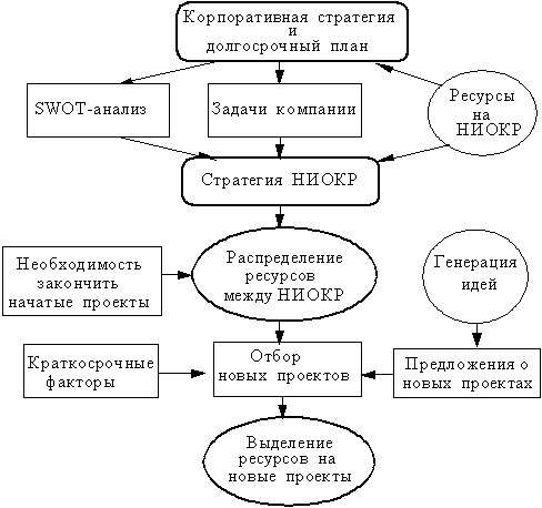 Одной из задач стратегического менеджмента корпорации является управление инновациями, прежде всего, посредством решений по отбору проектов и распределению ресурсов. При этом необходимо обеспечить комплексный процесс принятия решения от верхнего уровня менеджмента до уровня управления НИОКР. Процесс принятия решений относительно НИОКР на уровне корпорации проиллюстрирован на рис. 2.2.