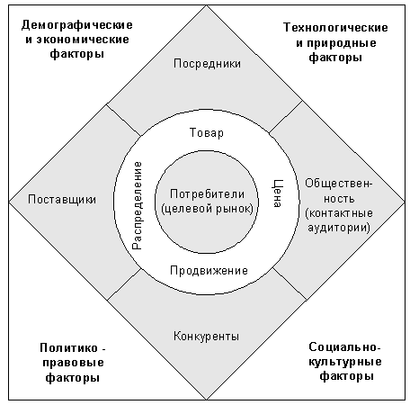 Маркетинговая среда включает в себя все силы, оказывающие влияние на способности предприятия устанавливать и поддерживать эффективные связи с целевым рынком. Она состоит из внешней микро и макросреды и внутренней среды.