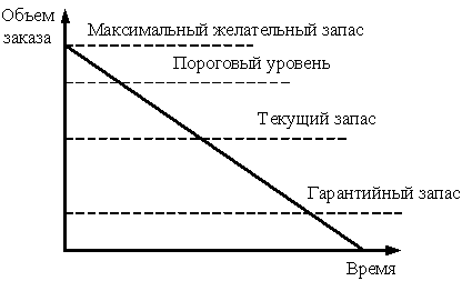 Основная идея. В данной системе заказы производятся не только в фиксированные плановые моменты времени, но и при достижении запасом порогового уровня. Объем заказа определяется по принципу восполнения запаса до максимального желательного уровня соответственно от текущего или от порогового уровня запаса (с учетом потребления за время поставки).
