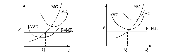 3. Если Р=МС<АС, фирма несет убытки, но будет продолжать функционировать в краткосрочном периоде (минимизация убытков), (рис. 13.4).