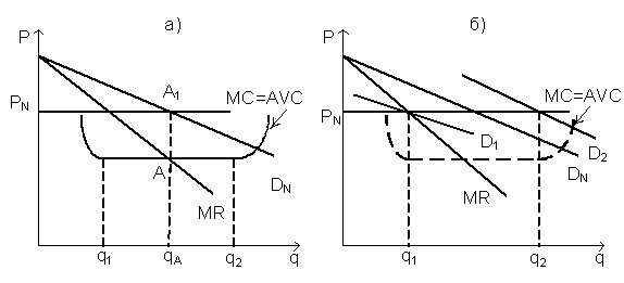 Так как любая фирма максимизирует свою прибыль при MR = MC, а кривые AVC и МС совпадают, то соответствующие значения цены и объема определяются пересечением кривых MR и MC=AVC (А'А). Цена РN – «нормальная» цена. Она берется за основу и в случае изменений спроса (кривые D1 и D2 на рис. 16.2) не меняется, а объемы продукции уменьшаются (до q1) или увеличиваются (до q2).