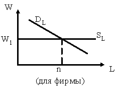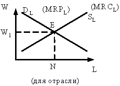 Здесь DL отражает предложение продукта в денежном выражении в данной отрасли; SL показывает предложение труда в альтернативных отраслях. В точке Е MRPL=MRC, т.е. W1 – оптимальный уровень зарплат, а N – оптимальное предложение труда.