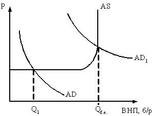 Циклическая безработица связана с экономическими циклами и представляет собой отклонение фактического уровня безработицы (при Q1) от естественного (при Q f.e.1). Она связана с недостаточным совокупным спросом на товары и услуги (AD).
