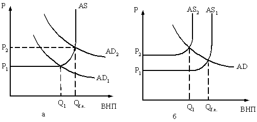 В мировой практике известны два вида инфляции: спроса и предложения. Инфляция спроса возникает как следствие избыточных совокупных расходов (AD1 -> AD2), (например, из-за роста зарплаты) в условиях, близких к полной занятости (Qf.e). Рост AD стимулирует не столько объемы производства, сколько рост цен (Р1 -> Р2) (рис. 25.1,а).