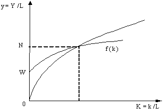 Капитал и труд вознаграждаются на основе соответствующих предельных производительных факторов. Вознаграждение капитала определяется тангенсом угла наклона к кривой f(K) в точке Р – предельная производительность капитала. Тогда, WN – доля капитала в общем продукте; OW – доля заработной платы в продукте; OW - весь продукт.